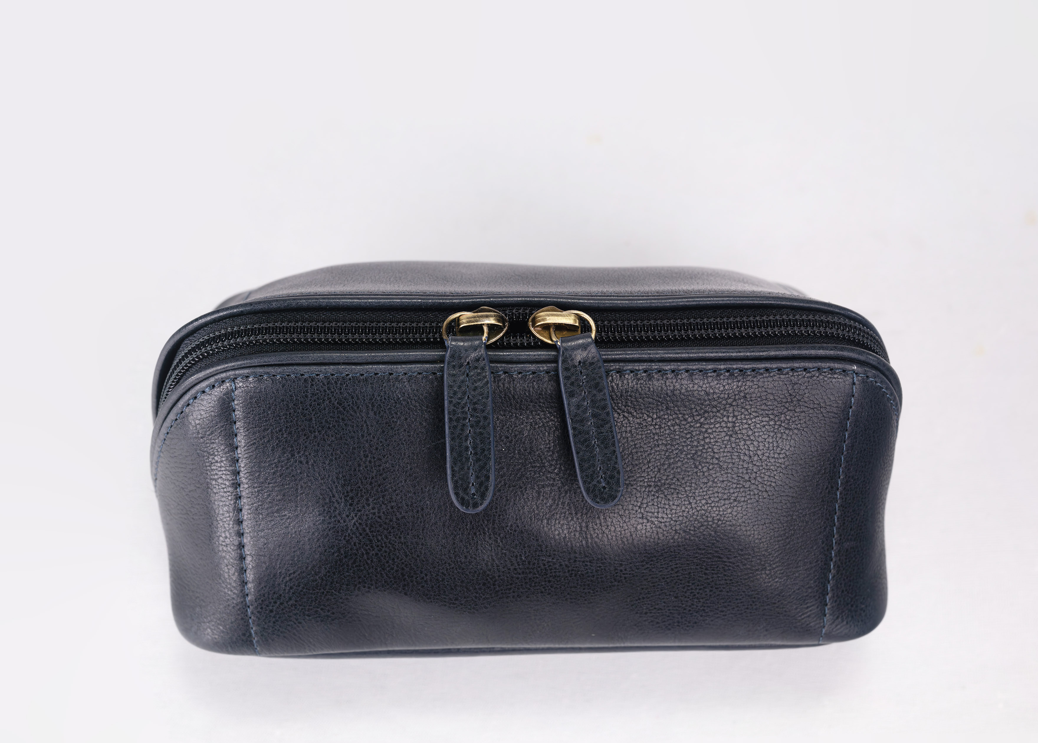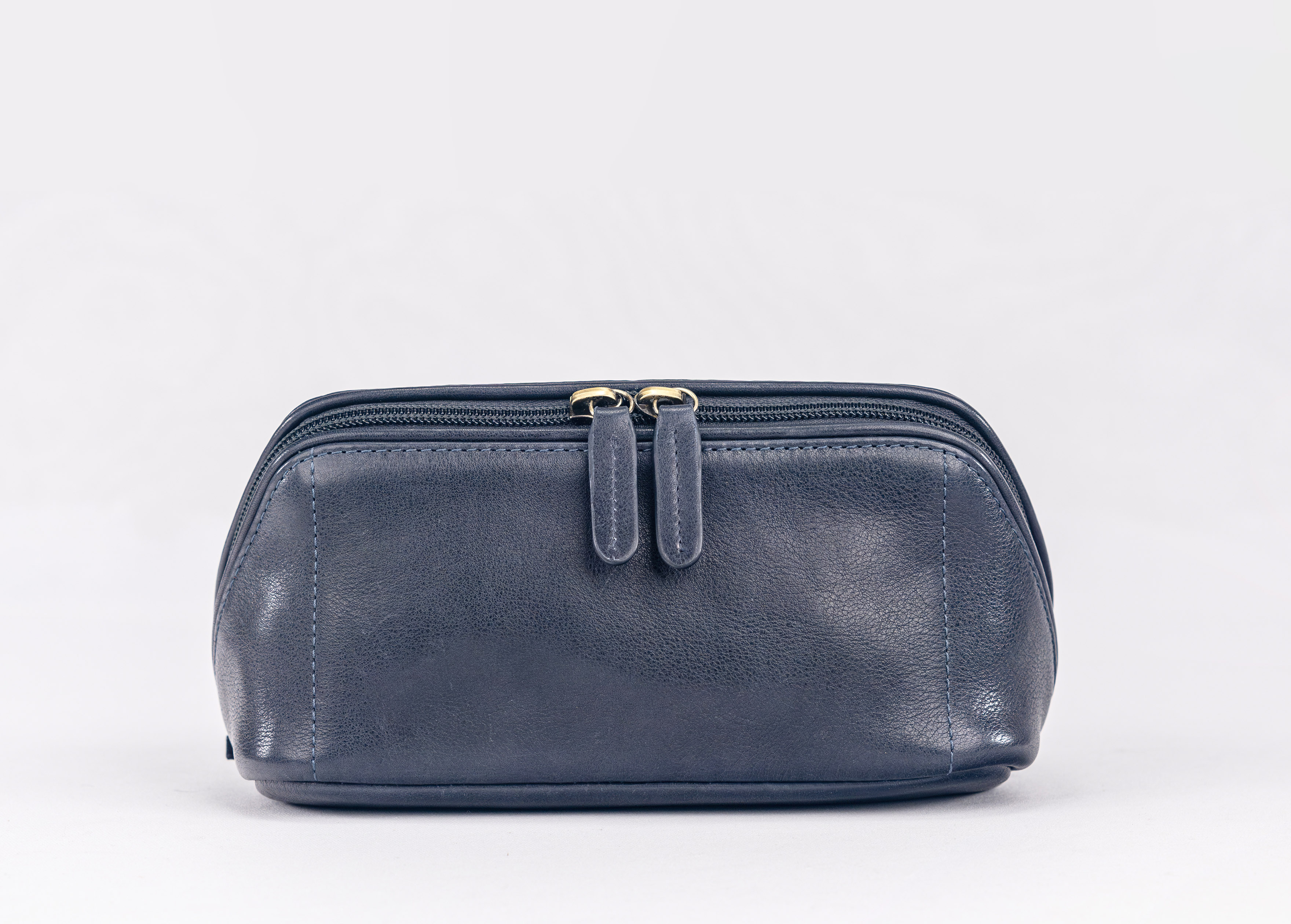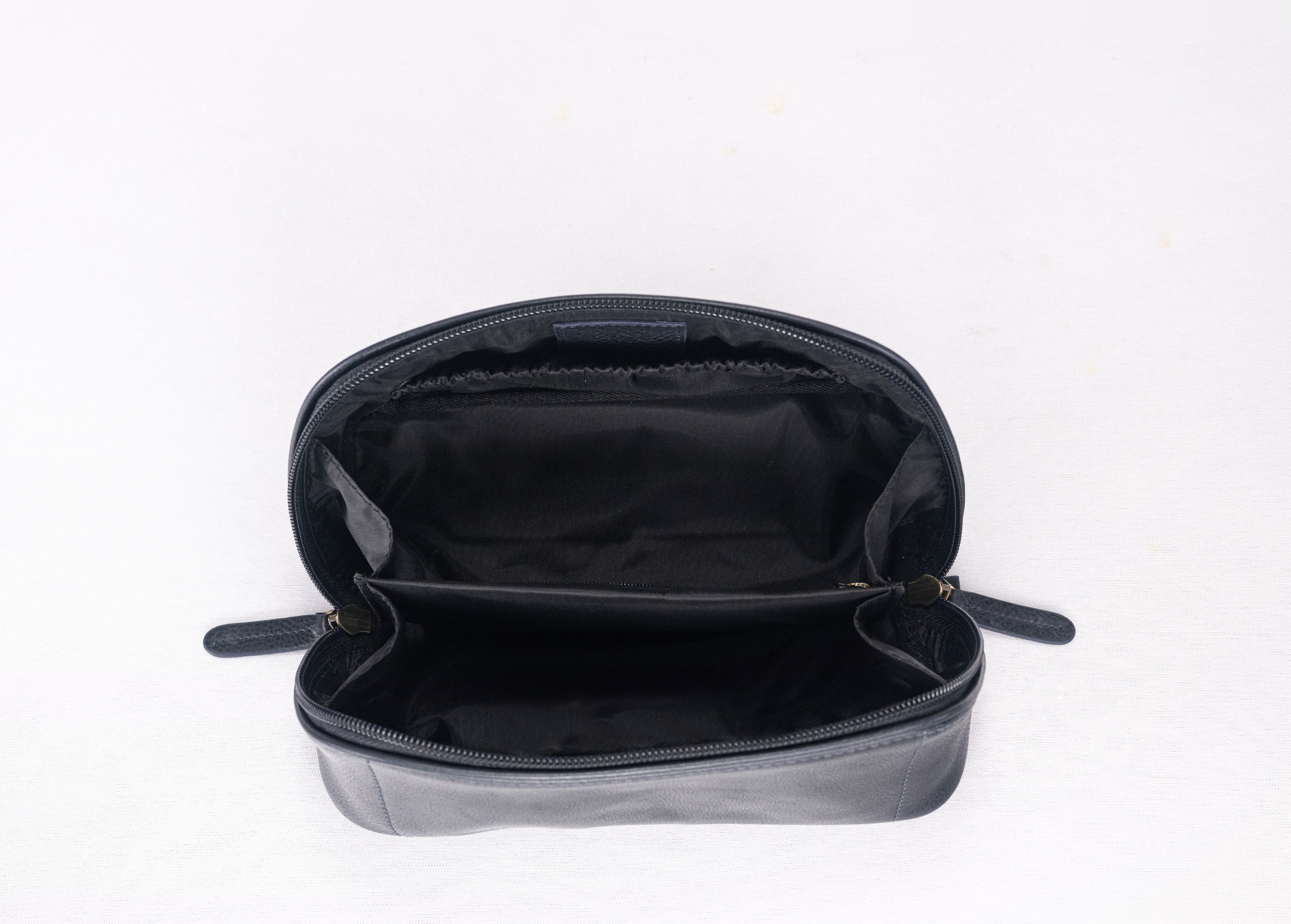 Inside, two organized compartments provide space for grooming tools, makeup, or small daily essentials, ensuring everything stays neatly in place. A sleek zipper closure runs seamlessly across the front surface, complete with a matching leather pull tab that accentuates its refined form.