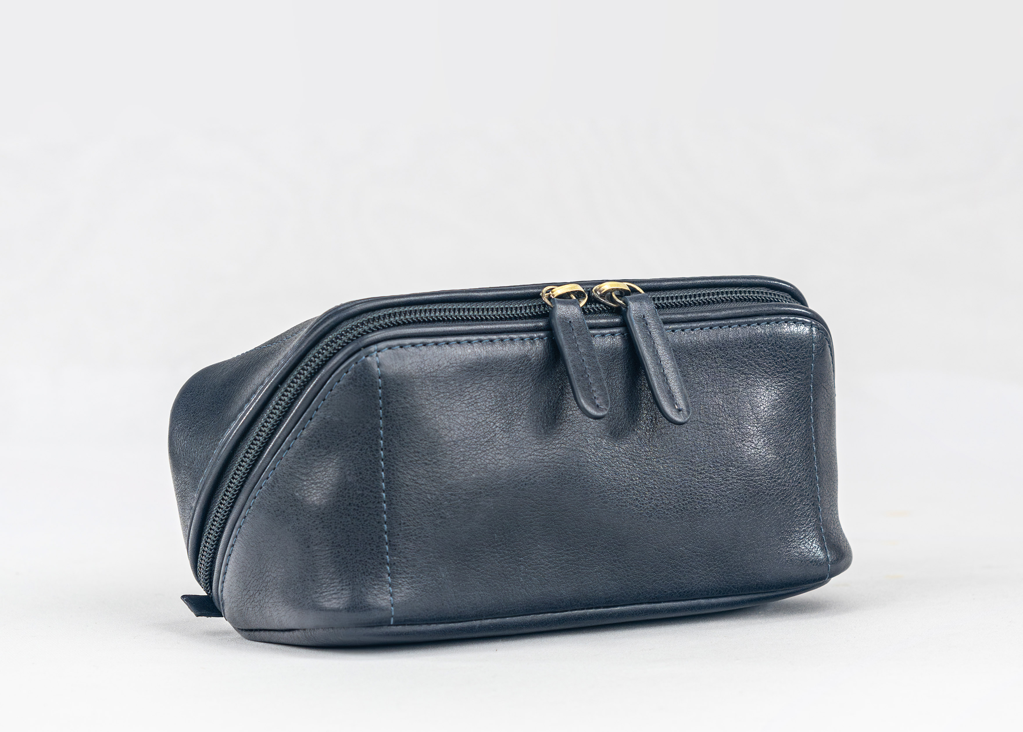 Inside, two organized compartments provide space for grooming tools, makeup, or small daily essentials, ensuring everything stays neatly in place. A sleek zipper closure runs seamlessly across the front surface, complete with a matching leather pull tab that accentuates its refined form.