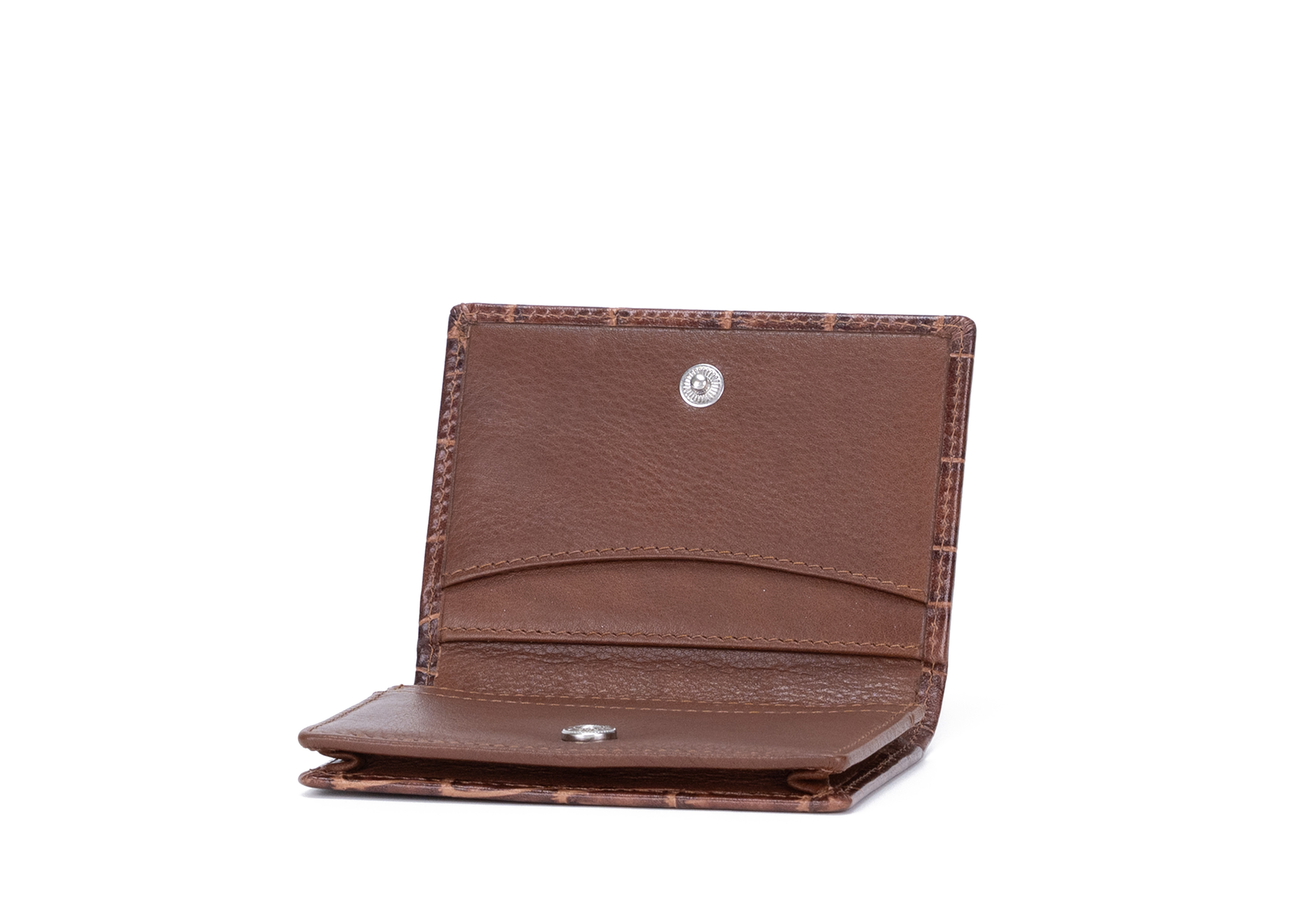 Inside, the wallet opens to reveal two inner panels, each featuring three slip pockets for essential cards. A 1 cm multi-card compartment at the center offers ample room for quick-access cards or folded notes. The layout is intuitive — no complex closures, just a clean, elegant fold secured with a polished metal button.