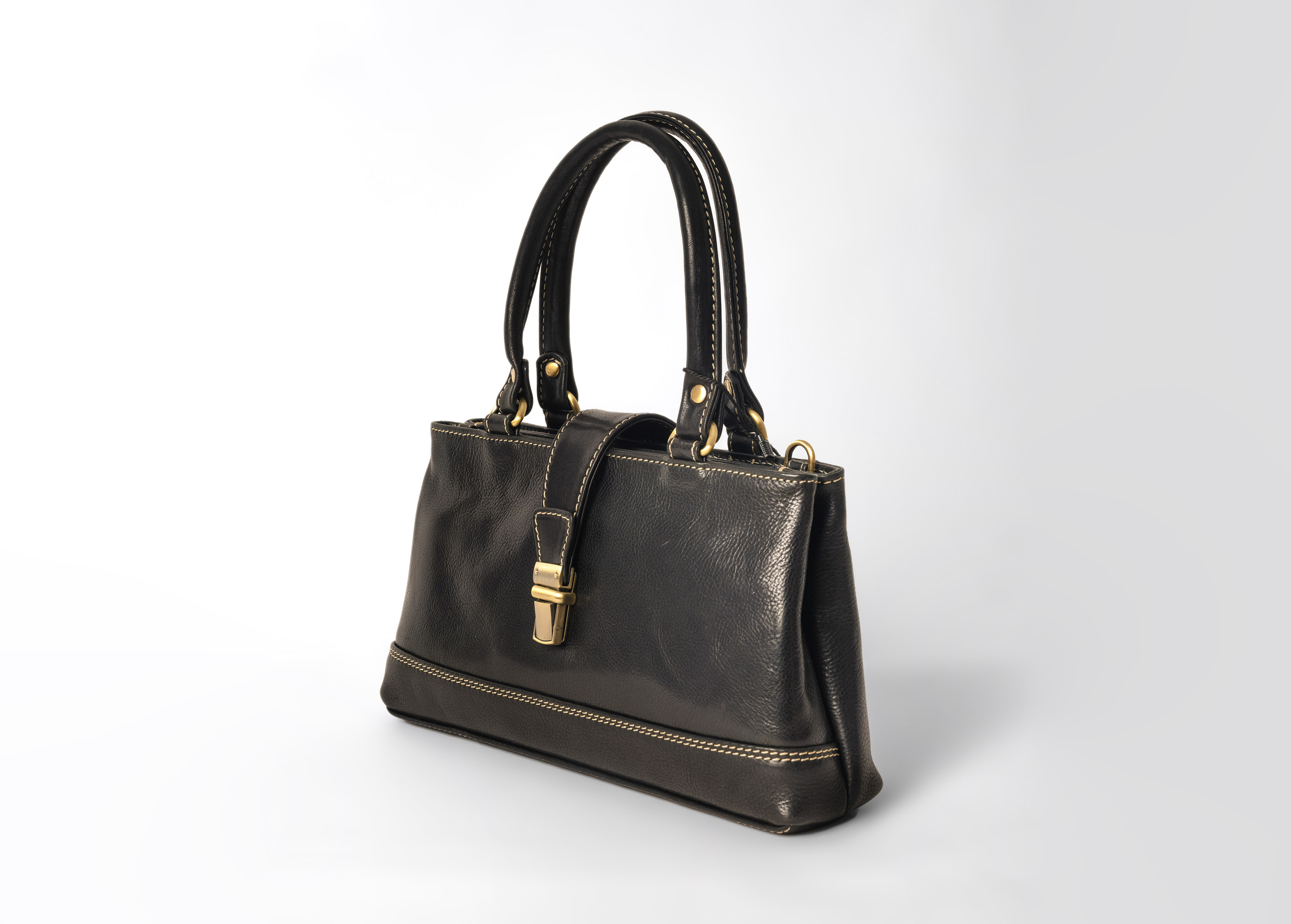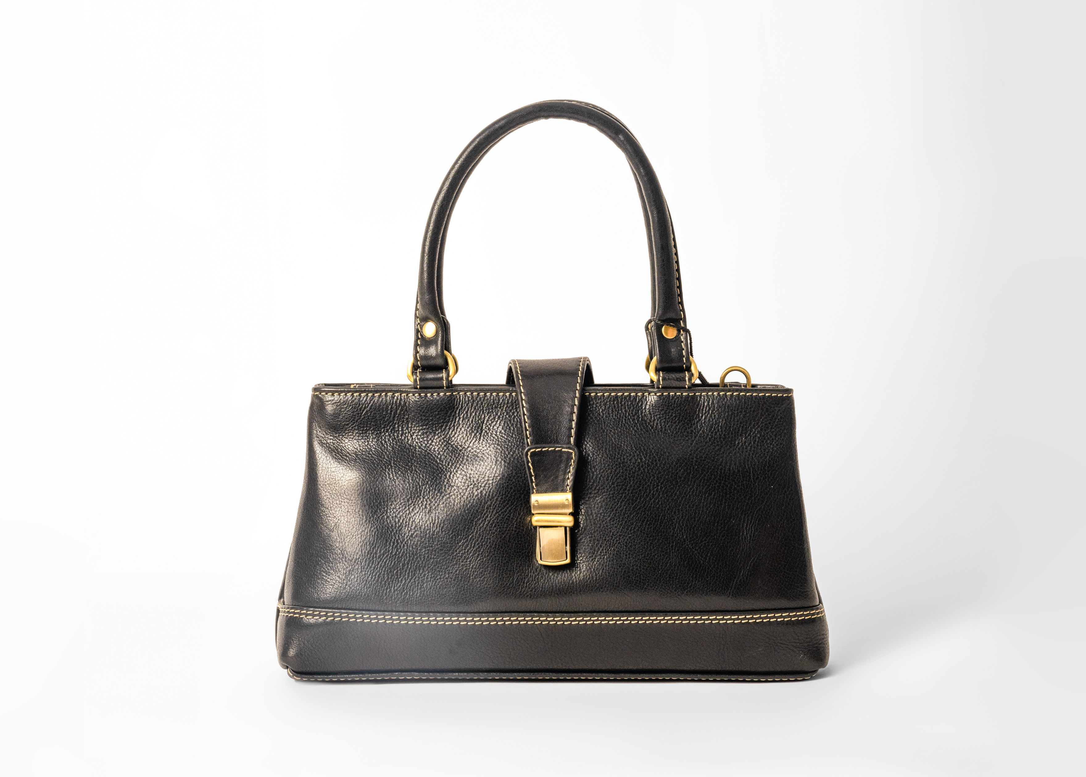 The bag features two zippered compartments securely enclosed under an arching clasp flap, offering both protection and panache. Inside, it’s intelligently designed for organization — with pockets for mobile, wallet, and valuables. The gold-finish hardware and sturdy top handles complement its lustrous leather texture, giving it a regal yet contemporary appeal.